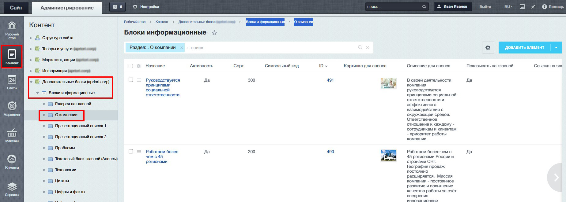 Контент → Дополнительные блоки → Блоки информационные → О компании