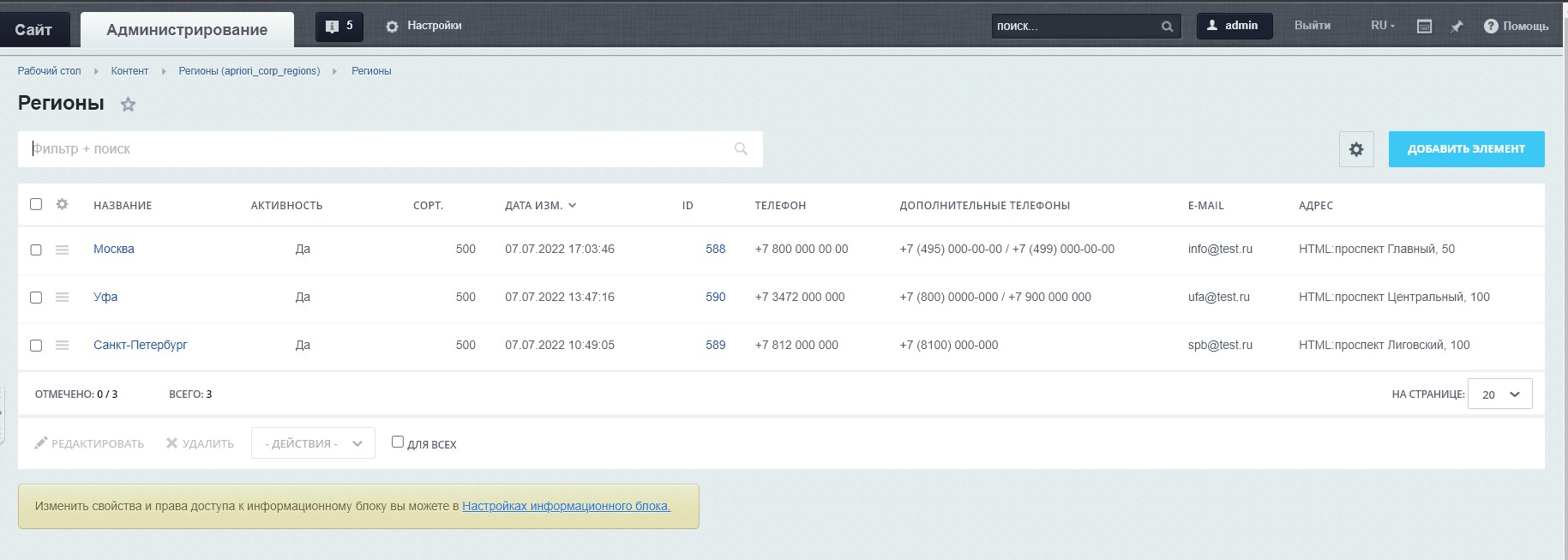 - Заполните в инфоблоке «Регионы» данные для городов, которые Вы хотите использовать. Вы можете создать любое количество городов: например, 2 филиала или 1000 городов России. Инфоблок создается автоматически при установке.