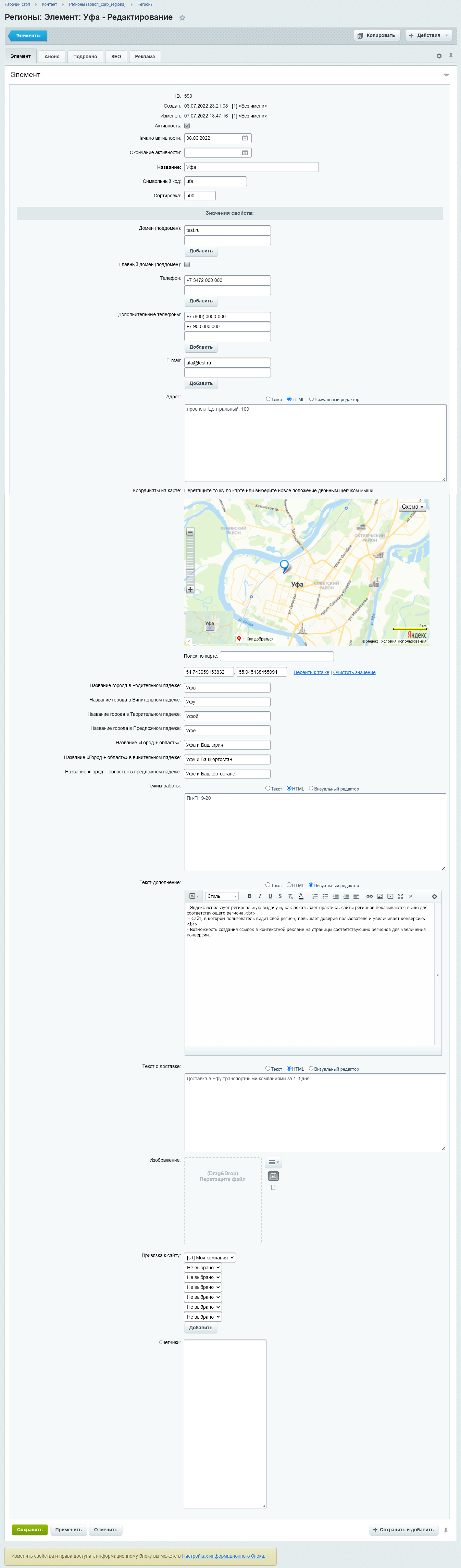 - Управление данными регионов: расписание работы, текстовая информация о доставке, изображение, координаты на Яндекс Карте и т. д.