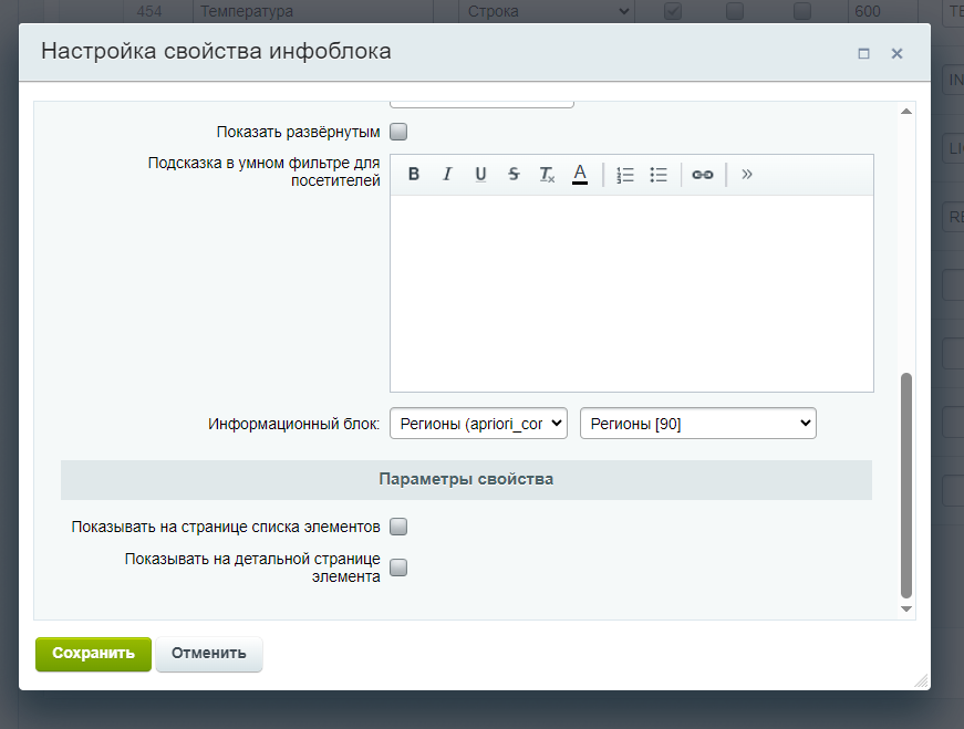- Секции — определяет, должны ли быть проиндексированы разделы инфоблока. Опция неактивна, если в настройках инфоблока не задан адрес страницы раздела или инфоблок не может содержать разделы (определяется настройками его типа).