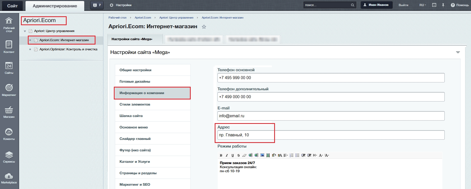 Apriori.Ecom (значок в левой панели в админке) → Apriori.Ecom: Интернет-магазин → Информация о компании.