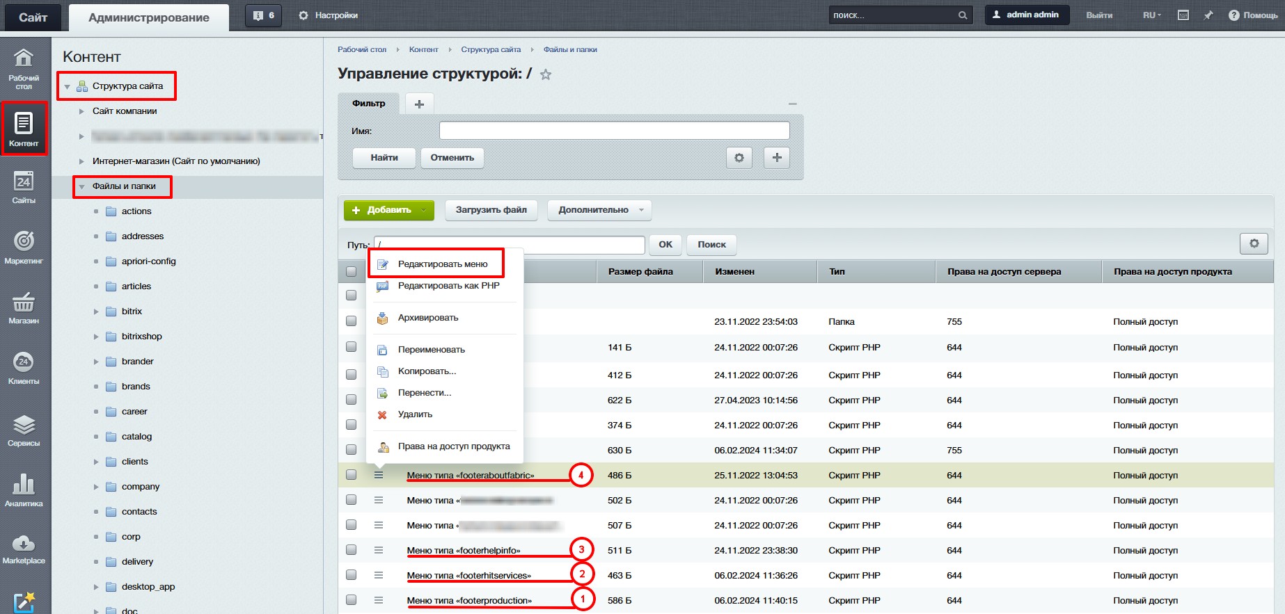 Контент → Структура сайта → Файлы и папки. Далее для каждого меню ищем свой файл и при необходимости вносим в него изменения через кнопку «Редактировать меню»: