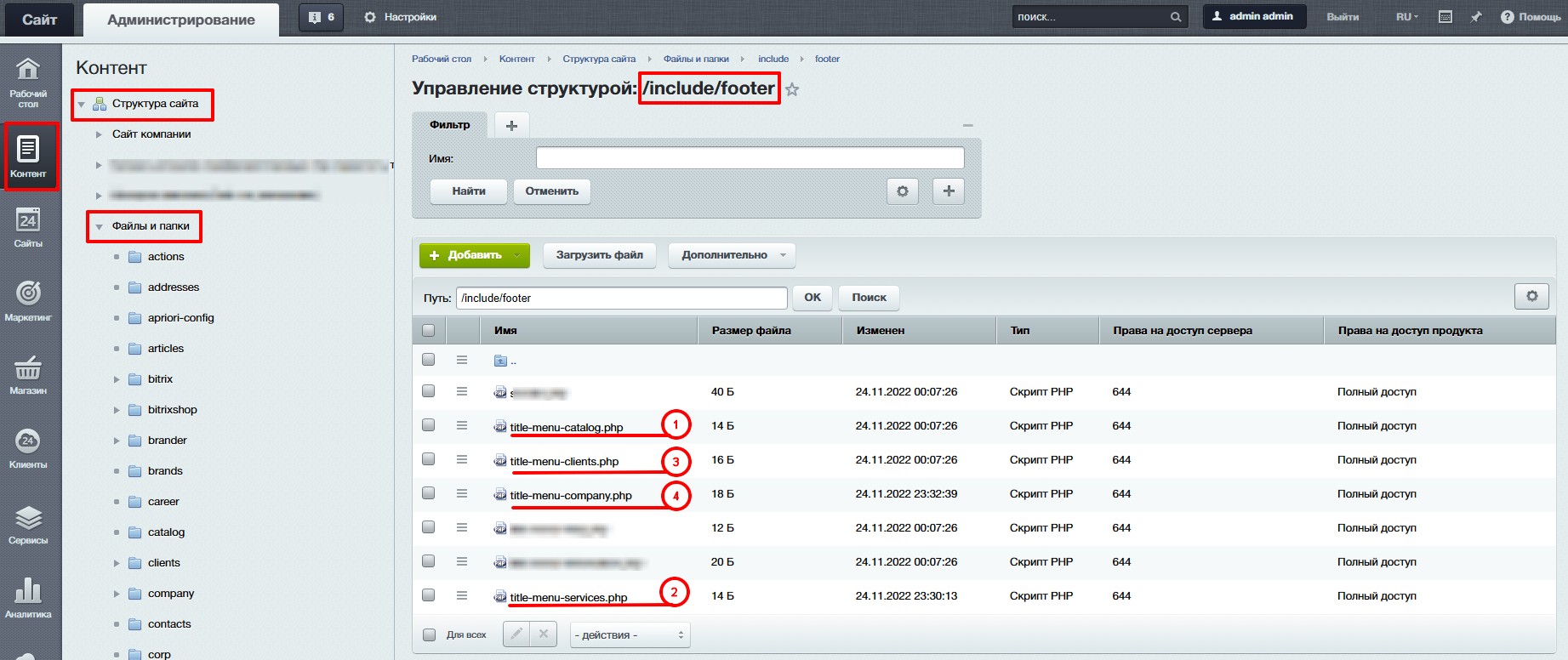 Контент → Структура сайта → Файлы и папки → папка include → папка footer.