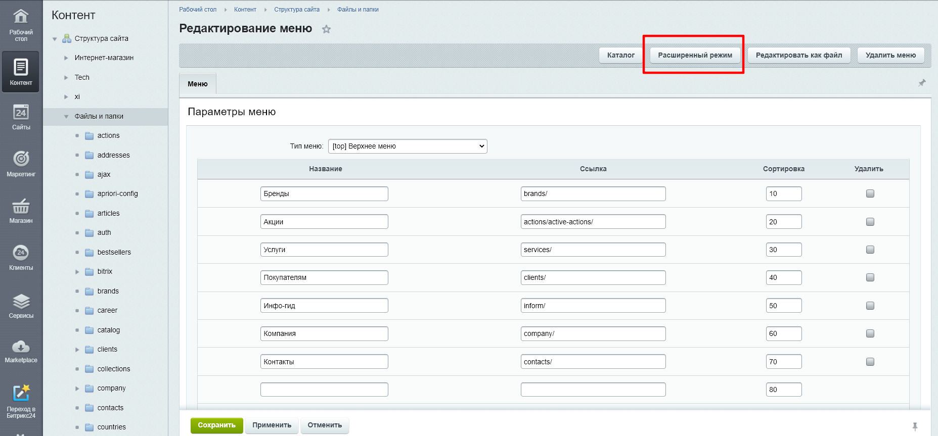 Найдите файл "Меню типа «top»" в корне сайта. Кликните правой кнопкой мыши и нажмите «Редактировать меню».