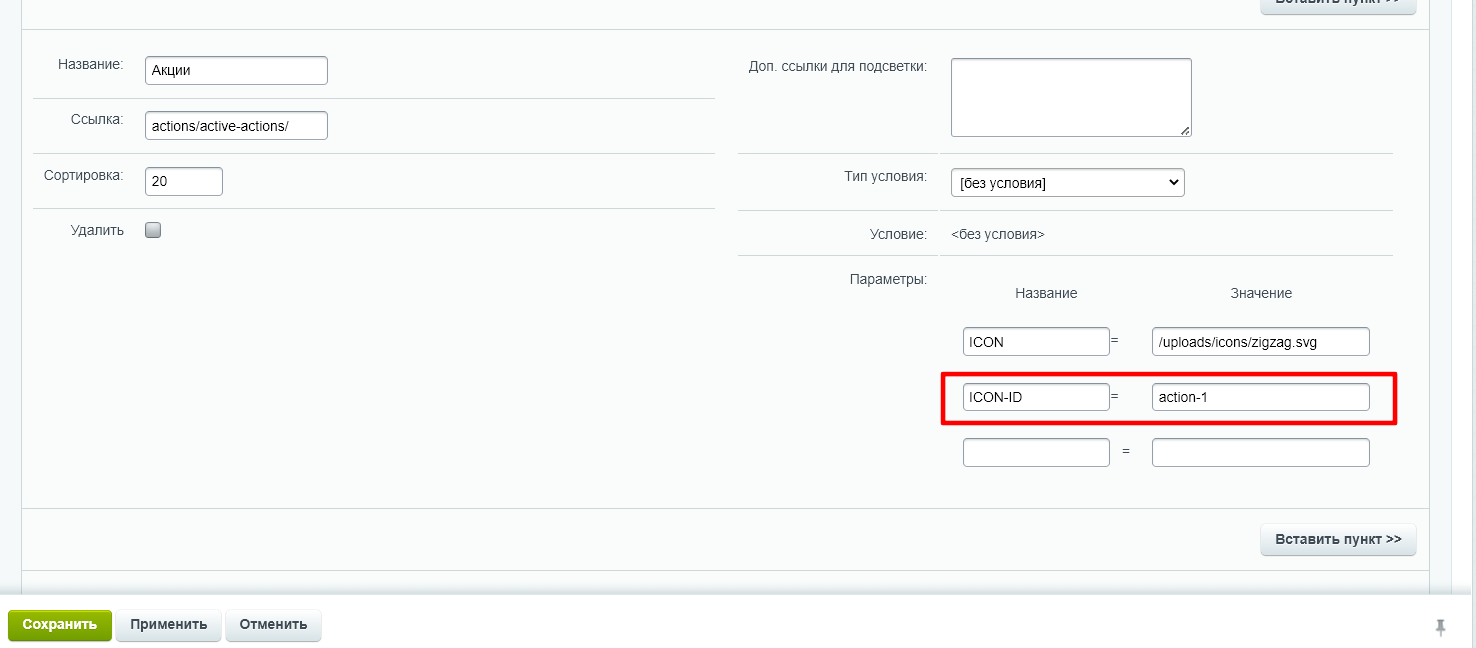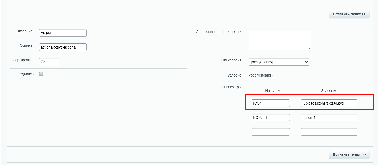 Добавьте предварительно картинку на сервер. Для пункта меню впишите: Название параметра - ICON Значение параметра — путь к иконке. Например, /uploads/icons/zigzag.svg