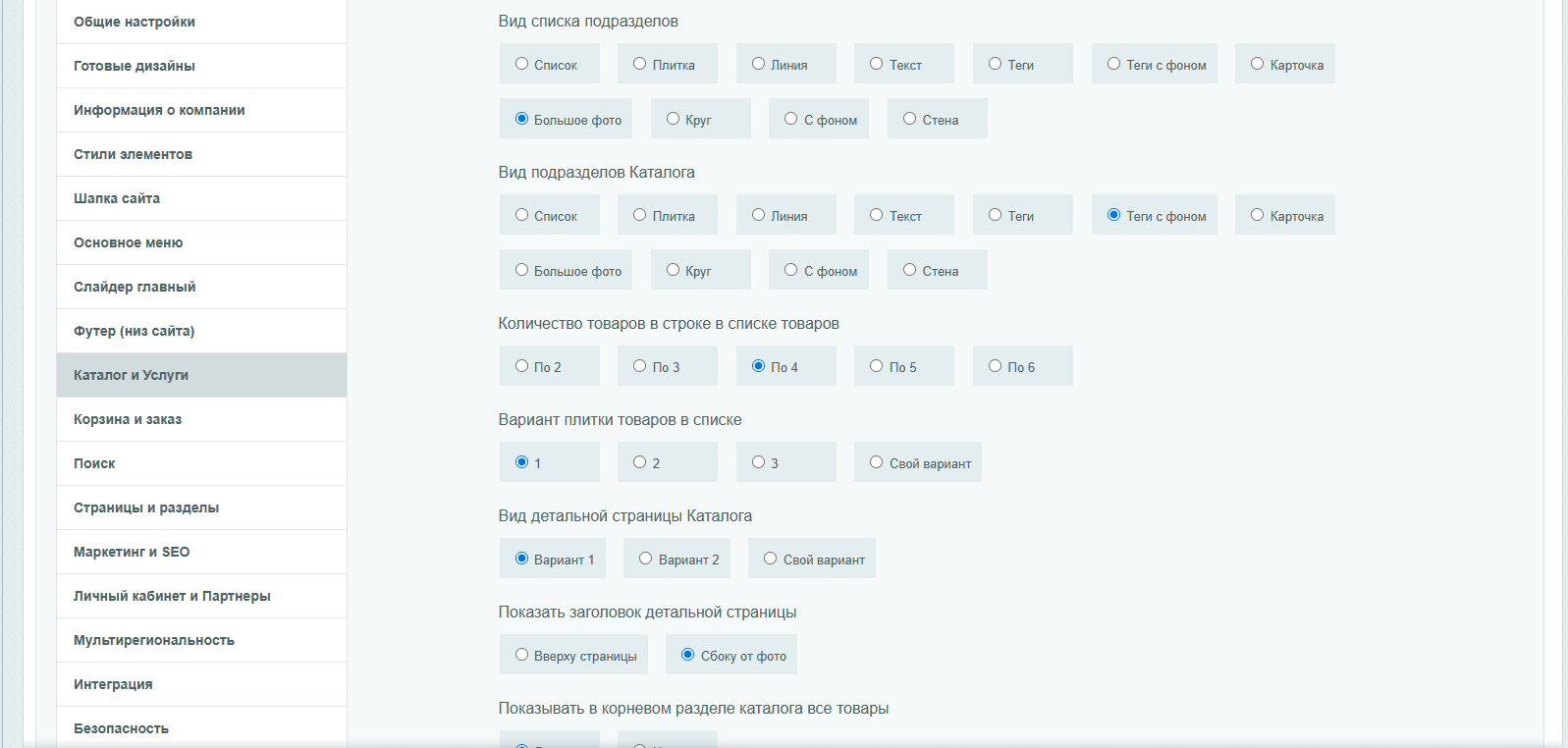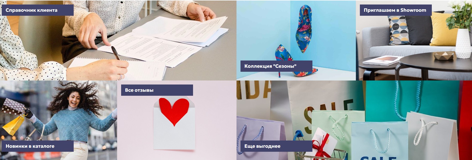 - Разделы: Идеи подарков, Lookbook, Проекты, Отраслевые решения, промостраницы.