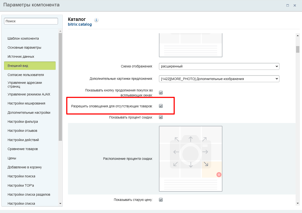 Чтобы пользователь увидел метку с указанием процента скидки, в настройках компонентов Каталог и Корзина необходимо отметить опцию «Показывать процент скидки» и указать её расположение.