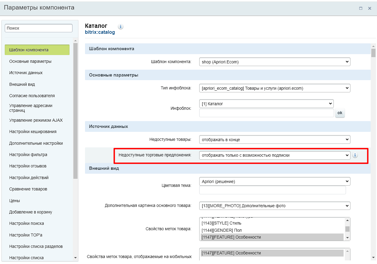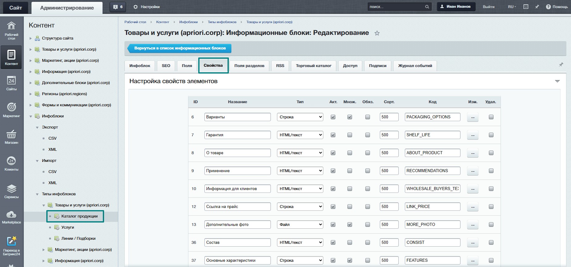 - Легкое управление свойствами — показ в списке товаров, показ на детальной, показ справа от слайдера товара, стандартное управление из админпанели и настройки компонентов.