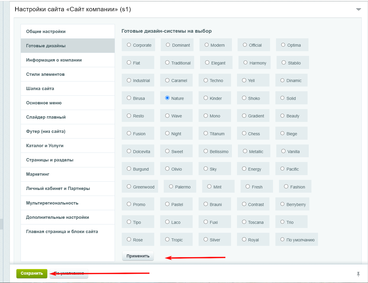 - Решение включает Конфигуратор дизайна, а также готовые дизайн-системы на выбор. Готовый дизайн может быть установлен как при установке сайта, так и в последующем. Обратите внимание — при установке готового дизайна его настройки заменят предыдущие сделанные вами настройки стилей в системе.