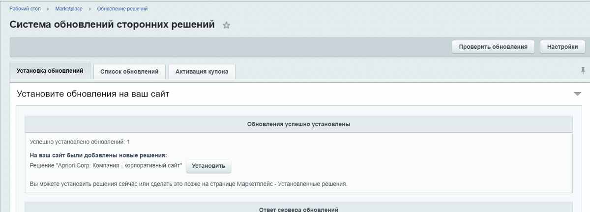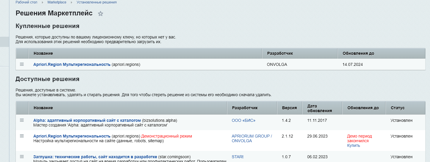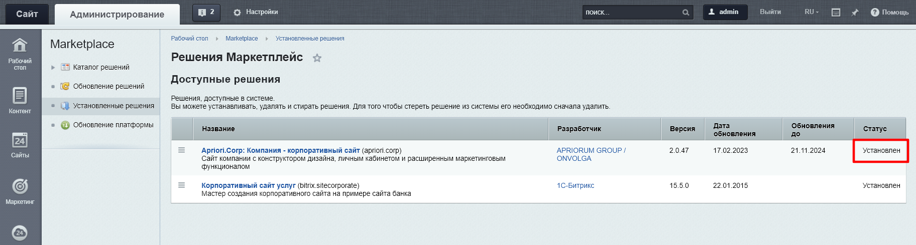 Если решение устанавливается в демо-режиме, перейдите на вкладку Маркетплейс, выберите решение и нажмите «Установить».