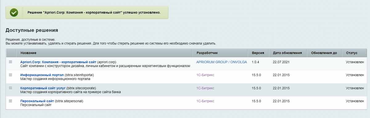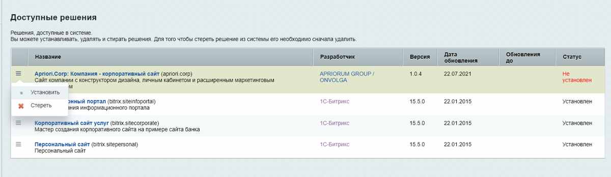 Для установки решения для тестирования: Перейдите в админпанели в раздел Маркетплейс. Задайте в поиск «Apriori.Corp». На странице решения нажмите кнопку «Тестировать».