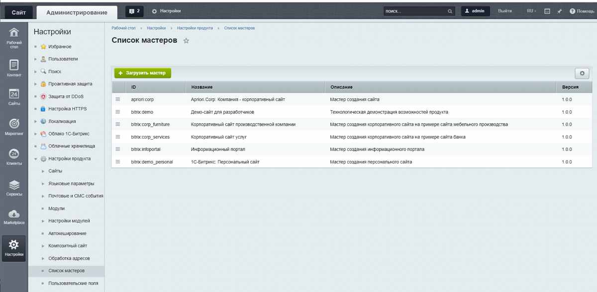 Перейдите в Настройки > Список мастеров https://вашдомен/bitrix/admin/wizard_list.php?lang=ru.