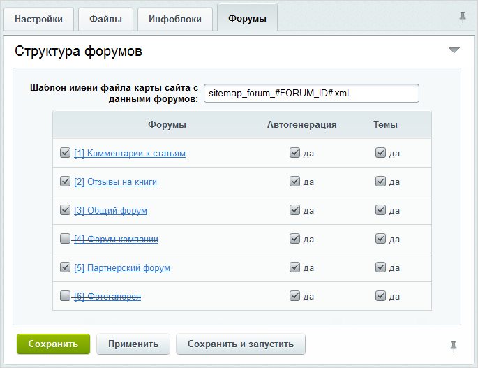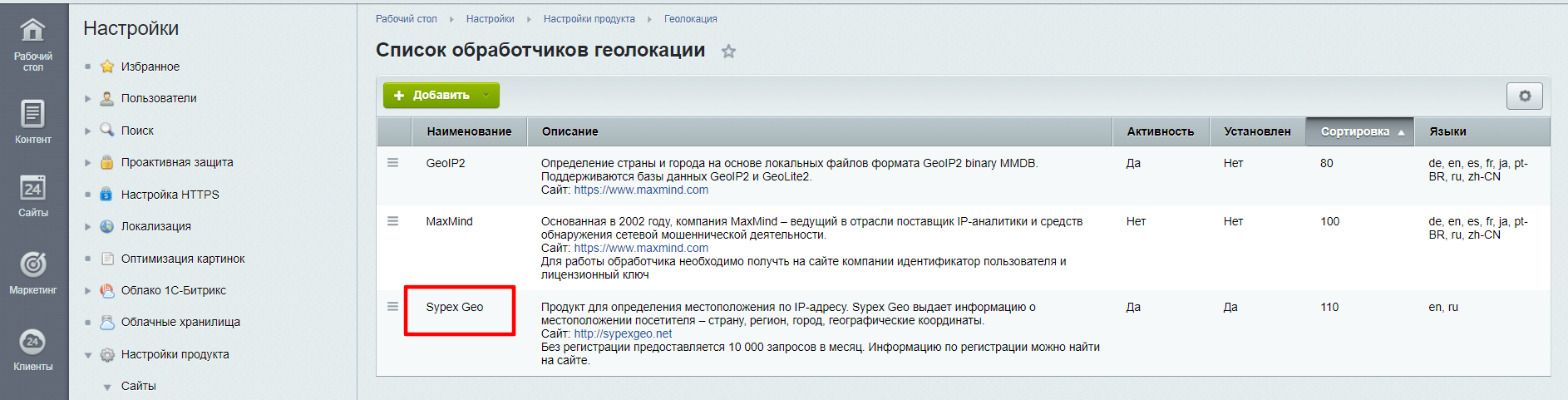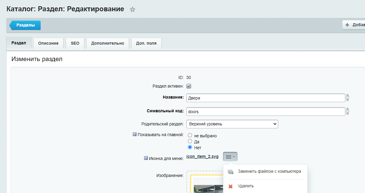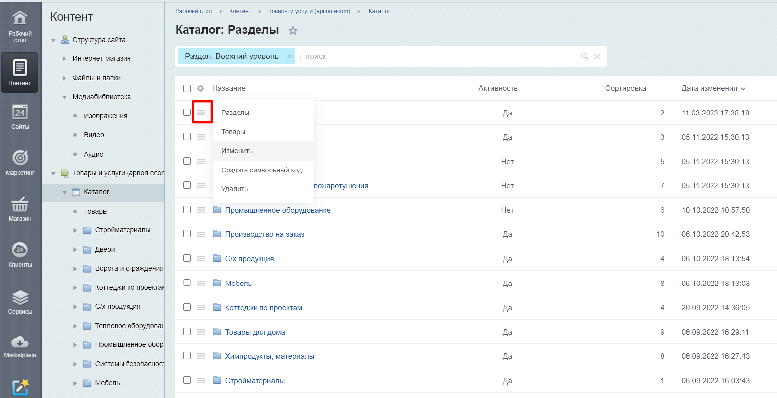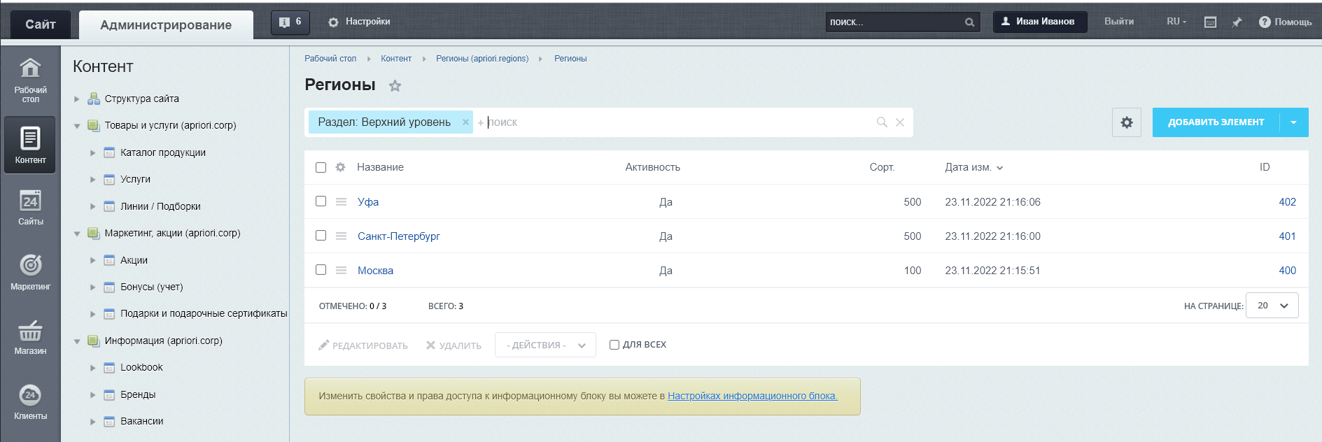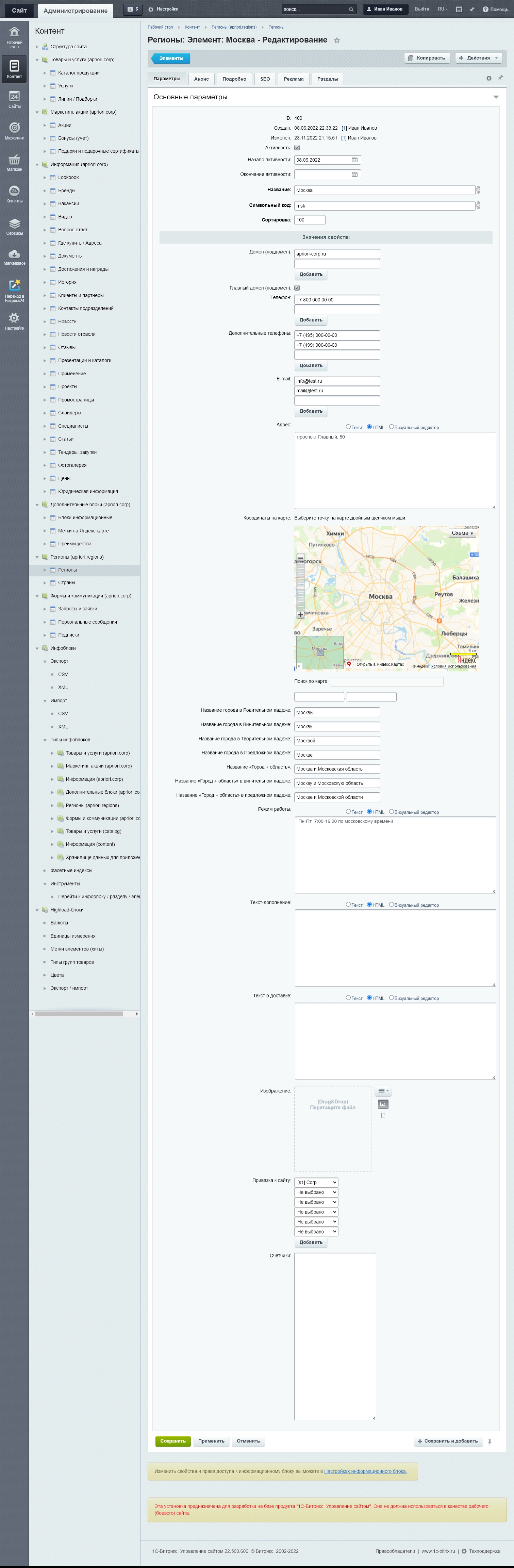 - название – произвольное название на латинице, наряду с идентификатором используется в различных административных формах для указания привязки к тому или иному сайту.
