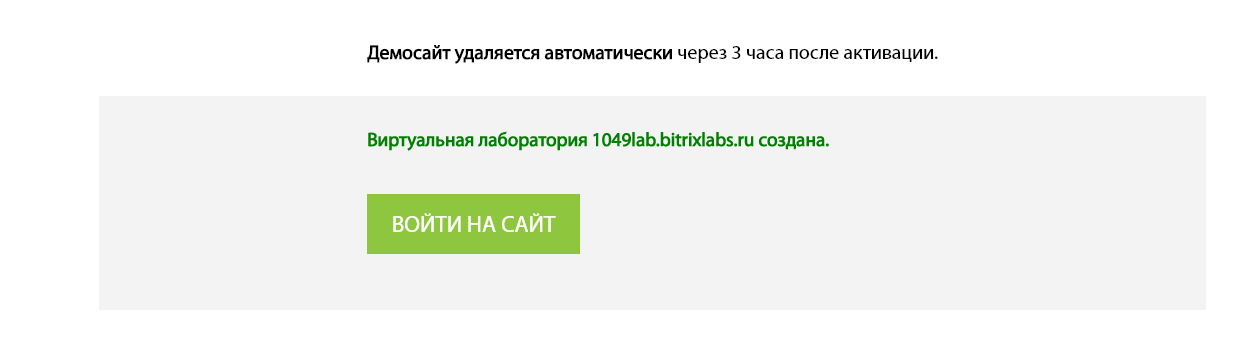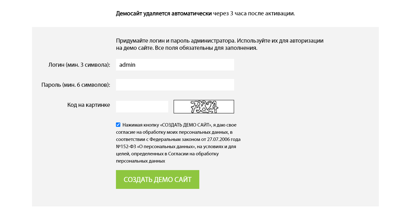 Примечание: демо-сайт удаляется автоматически через 3 часа после активации.