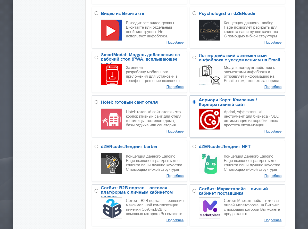 Шаг 4. На следующем шаге найти решение Априори.Корп: Компания / Корпоративный сайт (Apriori.Corp), выбрать его.