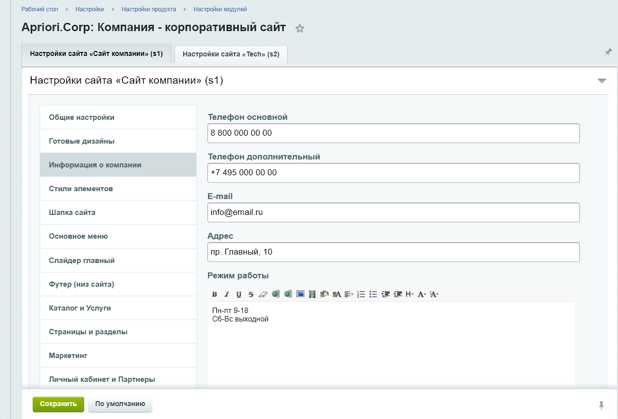 Заполните основную информацию о компании в настройках решения на вкладке «Информация о компании».