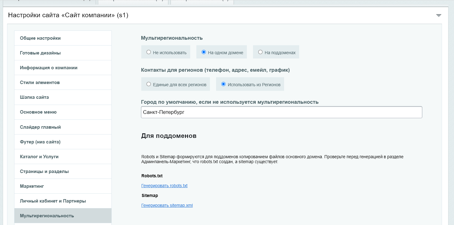 Регион сайта — задается или в настройках мультирегиональности или в поле на вкладке «Мультирегиональность».